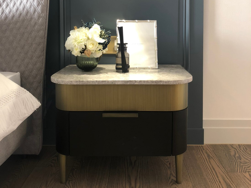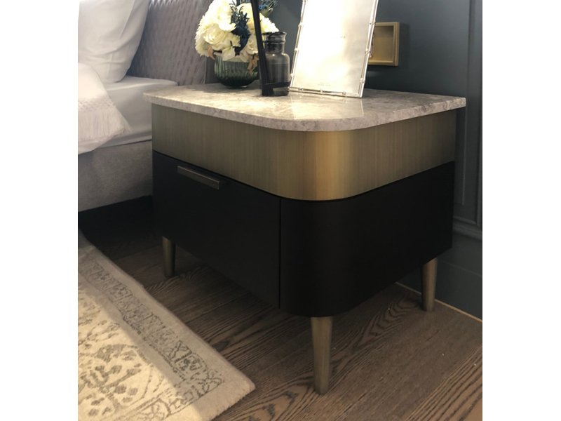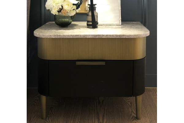 材質:檯面大理石(選購)、櫃體栓木染深胡桃木色、仿古銅拉絲色、腳底仿古銅拉絲色