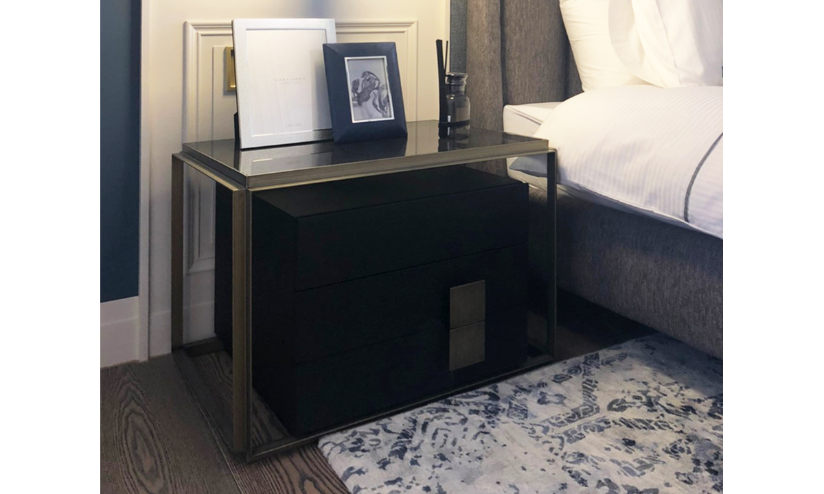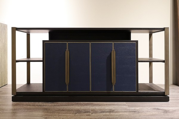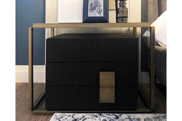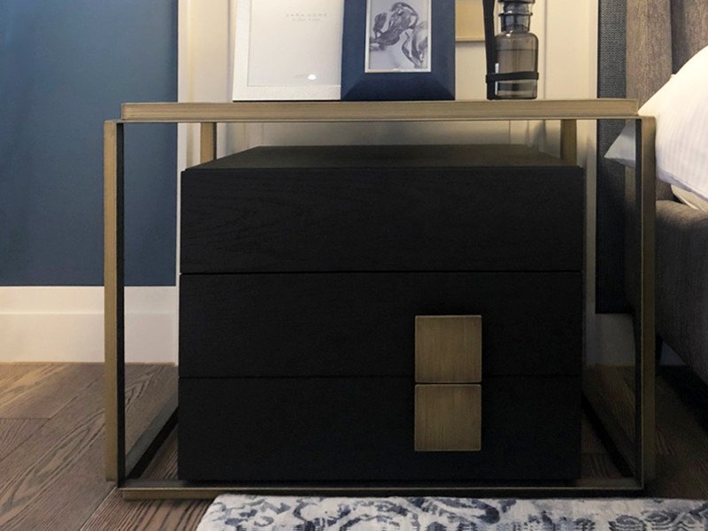 材質:灰色玻璃檯面、金屬框古銅拉絲色、櫃體橡木染深胡桃木色、金屬把手古銅拉絲色