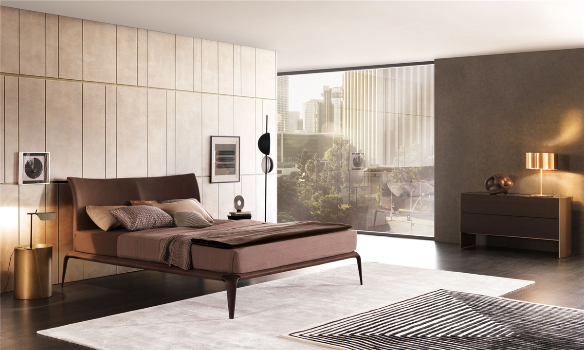床头板由两个独立可调节元素组成,整体创造出一个曲线面,使睡眠区成为一个时尚之所。可提供有撑脚或自带存储功能两种类型。