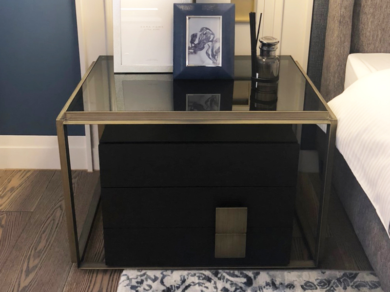 材質:灰色玻璃檯面、金屬框古銅拉絲色、櫃體橡木染深胡桃木色、金屬把手古銅拉絲色