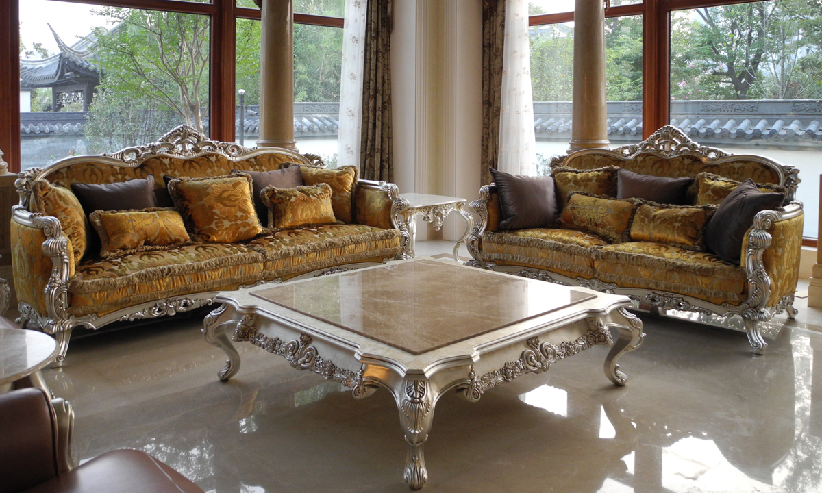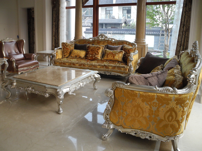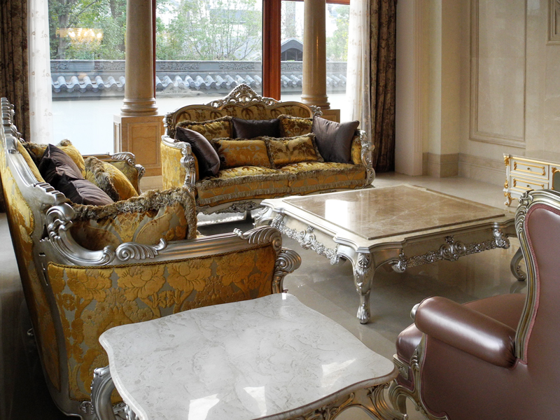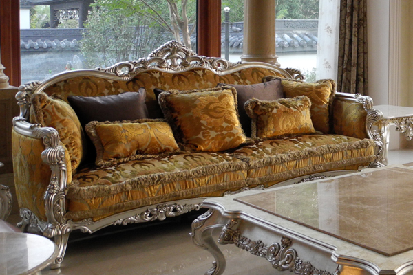 選用金色緹花絨布與銀箔仿古雕刻呼應,